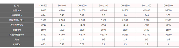 不銹鋼旋振篩分機(jī)型號(hào)有:DH-400mm、DH-600mm、DH-800mm、DH-1000mm、DH-1200mm、DH-1500mm、DH-1800mm、DH-2000mm等八種標(biāo)準(zhǔn)型號(hào)。(可以按照用戶(hù)的需求進(jìn)行特殊型號(hào)定制)