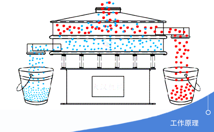 不銹鋼旋振篩分機(jī)采用直立式電機(jī)作激振源,當(dāng)篩機(jī)啟動(dòng)后,電機(jī)上、下兩端安裝的偏心重錘,將電機(jī)的旋轉(zhuǎn)運(yùn)動(dòng)轉(zhuǎn)變?yōu)樗?、垂直、傾斜的三次元運(yùn)動(dòng),再把這個(gè)運(yùn)動(dòng)傳遞給篩面。在此過(guò)程中,小于篩面孔徑的物料通過(guò)篩孔落到下層,成為篩下物,大于篩面孔徑的物料經(jīng)連續(xù)跳躍運(yùn)動(dòng)后從排料口排出,用戶(hù)通過(guò)調(diào)節(jié)上、下兩端重錘的相位角,可以改變物料在篩面上的運(yùn)動(dòng)軌跡,從而設(shè)計(jì)實(shí)現(xiàn)對(duì)物料的篩分。